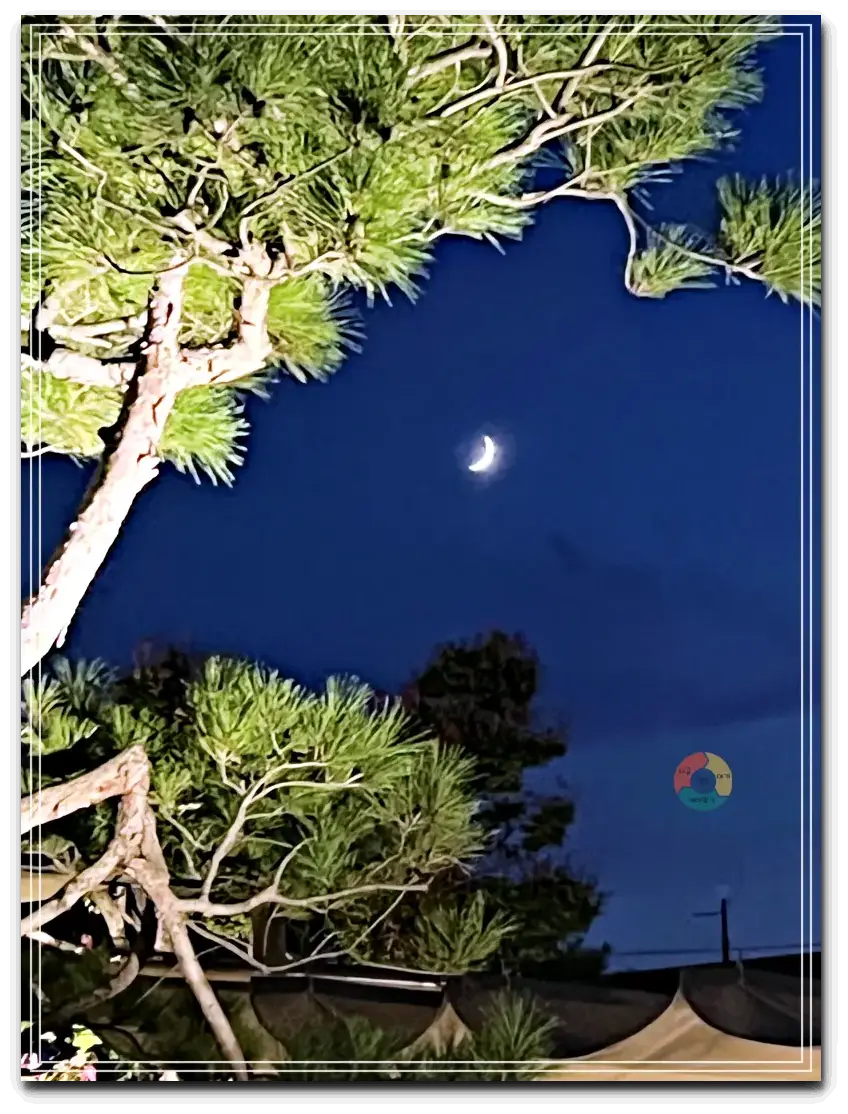 노을이 지고 나니 그 자리에 초승달이 떴네요, 초승달 바라보며, 그동안 살아온 내 인생도 돌아보고, 가장 즐거운 휴가를 보낸 2박 3일도 정리하며 하루를 마무리하였습니다.